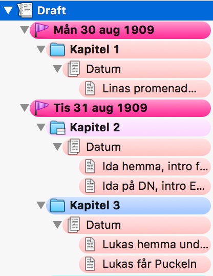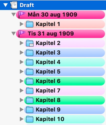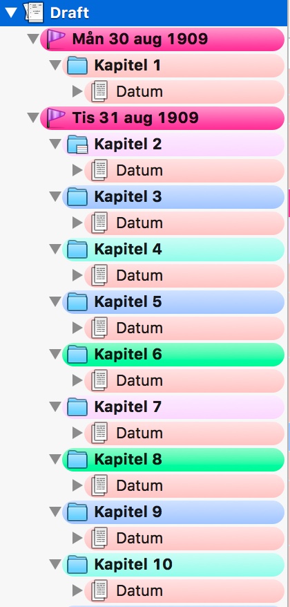 - Min nästa nivå är Kapitel, vilka jag har gett olika färger beroende på berättarperspektiv. Rosa för ett av mina berättarperspektiv, blått för ett annat och turkost för det sista. De gröna är nya kapitel jag precis skrivit in, som jag vill markera för mig själv. (Se hur man ger dessa färger i den här artikeln). I Compile (där man sammanfogar hela dokumentet till ett) har jag gjort så att mappnamnet, tex ”Kapitel 1”, är det som skrivs in i ett visst typsnitt i dokumentet. Genom det behöver man inte hålla på med extra formatering i själva dokumentet, det gör man vid sidan av.