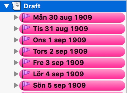 Nästa nivå är egentligen bara en datumrubrik som även har en platsangivelse, något som ska vara i ett annat typsnitt i mina dokument. Det är det enda som står i det dokumentet.- Den sista nivån är Scener. Varje scen har jag döpt för att jag i sidomenyn lätt kan se varje scen, och det har hjälpt mig att faktiskt inse att vissa scener är onödiga, andra scener saknas. Jag kan också kontrollera att varje scen uppfyller sitt syfte med att driva handlingen framåt och helst av allt har en känsla i början av scenen och en annan i slutet. Allt blir väldigt tydligt när det är uppdelat. När jag för några veckor sedan behövde omorganisera ett av mina manus (läs om varför i den här artikeln) gick det enkelt tack vare det här. Drag och släpp, så hade jag omorganiserat ett dokument på cirka trehundrasidor på ett par timmar.