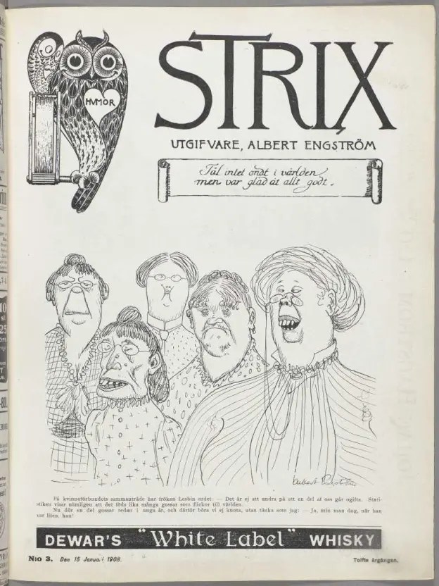 Men det hindrade inte männen från att klanka ner på kvinnorna inom LKPR, och mer än en gång förlöjligades de genom karikatyrer, tex som i Strix Nr 3 från 1908. Jämför den här karikatyren med bilden högst upp, så som kvinnorna faktiskt såg ut (som är från kvinnokongressen i Stockholm 1911). Visst var Strix en tidning som gjorde karikatyrer av mycket, men ändå. Det är uppenbarligen en del av propagandan mot den kvinnliga rösträtten och emancipationen.